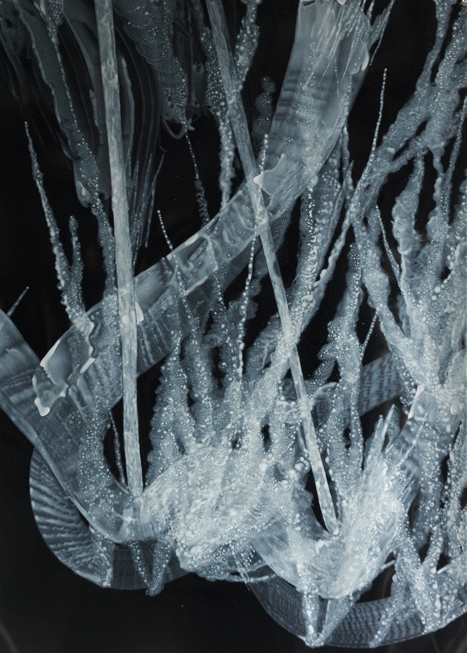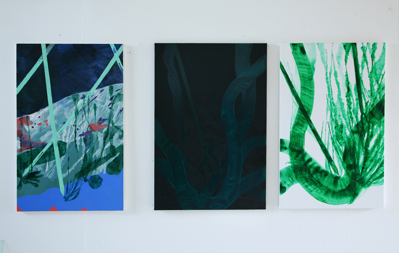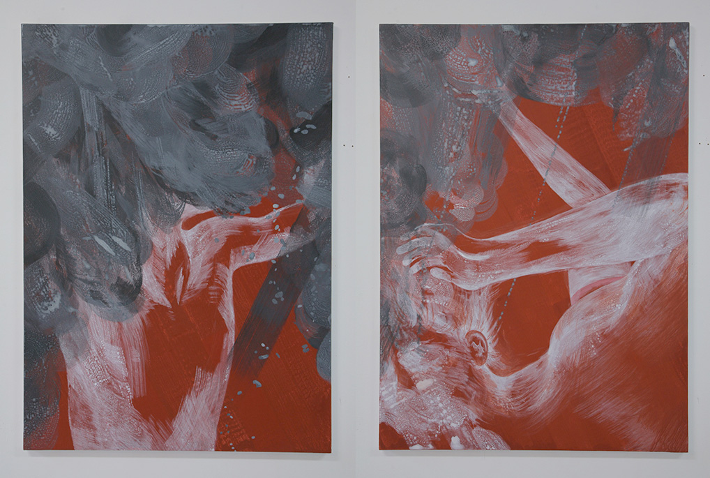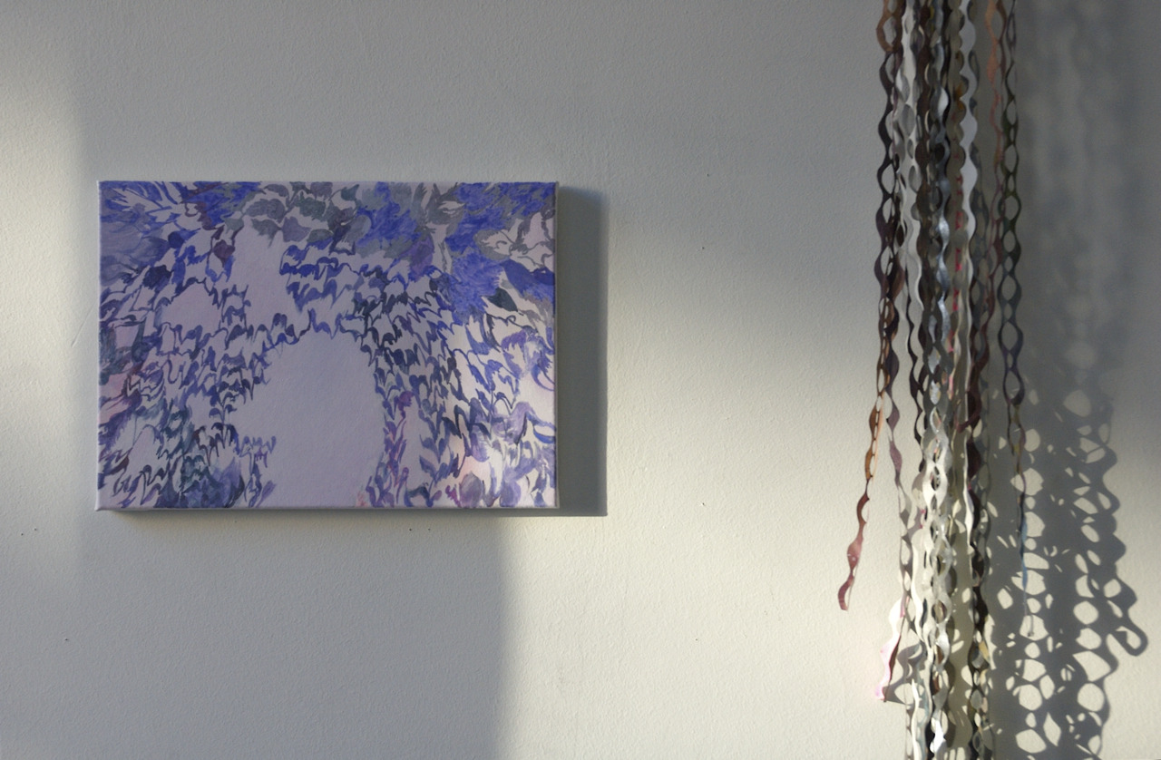 "untied / united"とは、"t"と"i"を入れ替えただけだが、意味は「ほどく / 統合する」となり反対のことをあらわす。'sound of material'シリーズで神話の構造に似ていると思えた制作の総体はいったいどう掴めるのか。それが未分化の巨体であるなら、どこかをズバッと切った断面しか見ることができないのではないか。創作全体に対するそのような途方に暮れるような感覚に対して、「個別の画面を切って分節しながら / 同時に縫合」できれば、全体が見えなくても問題ないのではないか、という考えの往復の中で制作した。